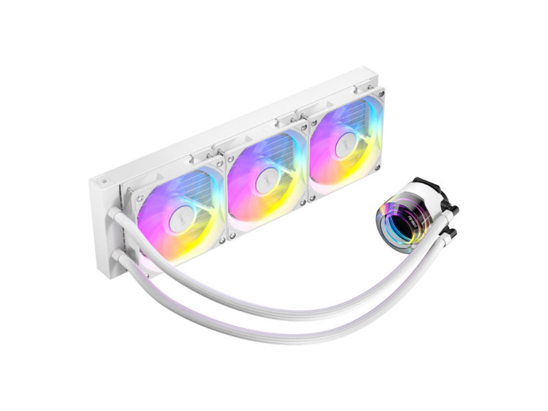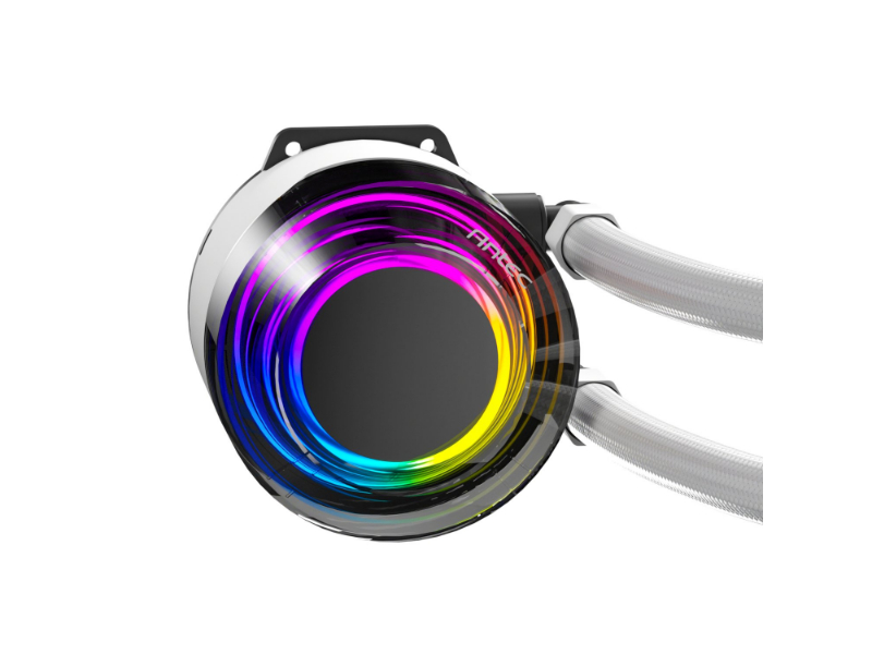 The Antec VORTEX LUM 360 ARGB AIO Liquid Cooler is designed for high-performance cooling, featuring a stunning suspended spiral pump head inspired by the swirling motion of a vortex. This unique design not only enhances aesthetics with vibrant ARGB lighting effects but also ensures superior cooling performance from multiple angles. With a 360mm aluminium radiator, this all-in-one liquid cooler efficiently dissipates heat, making it an ideal solution for gaming rigs and high-performance workstations.