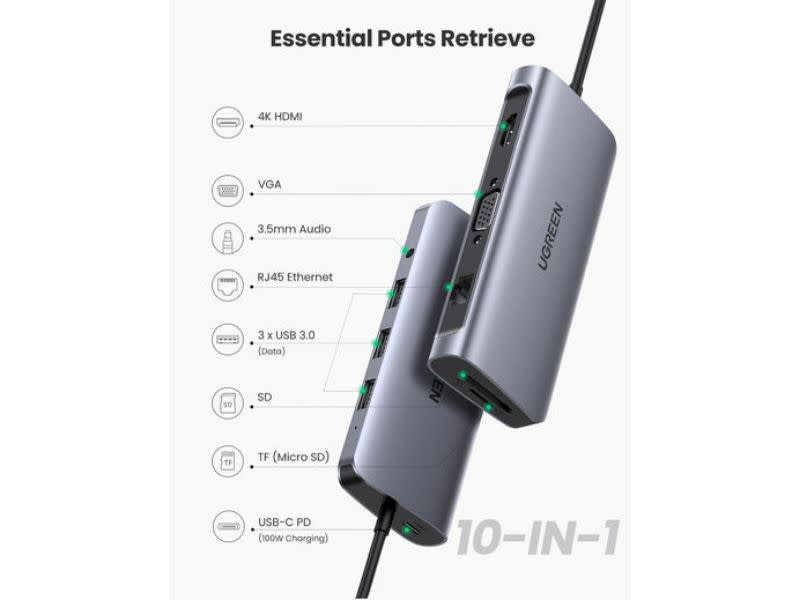 This 10-in-1 USBC multifunctional adapter allows to expand your USBC enabled device. This hub comes with 4K HDMI, 1080P VGA, Gigabit Ethernet, 3*USB3.0 ports, TF SD card reader, 100W USBC PD charging port and 3.5mm audio jack. The USBC multi-port does not require any drivers, simply plug and play.