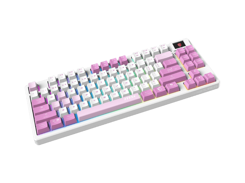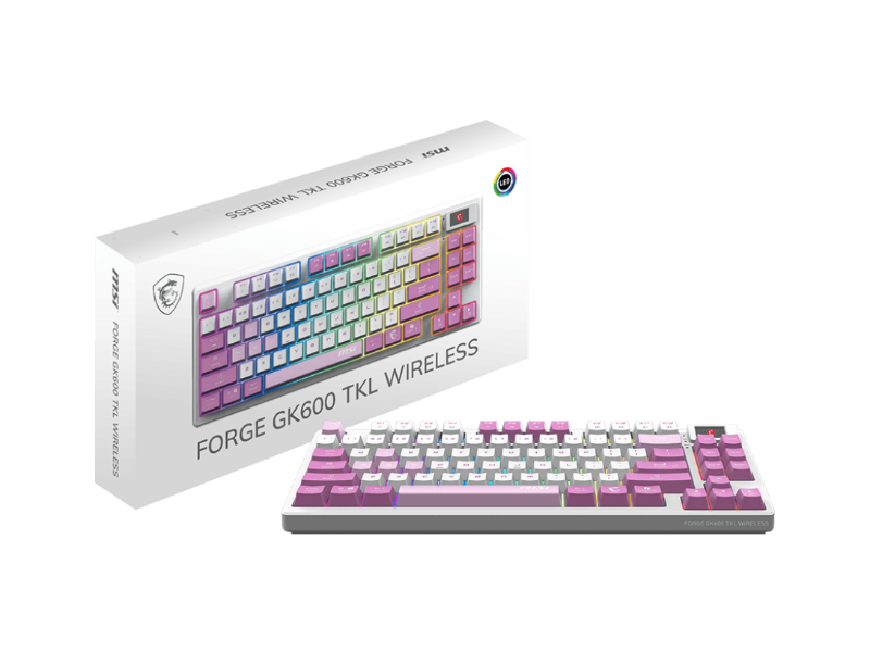 The MSI FORGE GK600 TKL WIRELESS VIOLET is a versatile tenkeyless keyboard with 2.4GHz wireless, Bluetooth, and wired modes. It features hot-swappable linear mechanical switches, durable PBT keycaps, sound-dampening gaskets, and a 1.06-inch display. With RGB lighting and a 4000mAh battery, it's ideal for gamers and creators.