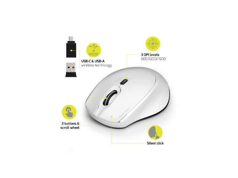 Work silently and accurately with the Port Connect Silent Wireless Mouse and its 1600DPI optical sensor. Its 2.4Ghz wireless connection allows for ranges of up to 20m and it is widely compatible with both a USB-A and a Type-C connection.