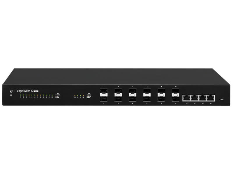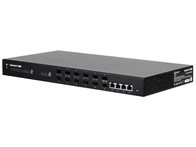 ES12-F, EdgeSwitch™ Fiber from Ubiquiti is a fully managed, Gigabit fiber switch, delivering robust performance and intelligent switching for high‑bandwidth networks. For fiber connectivity, the EdgeSwitch Fiber features 12 SFP ports, eight of which also support 100 Mbps. For copper connectivity, the EdgeSwitch Fiber offers four Gigabit RJ45 ports. The EdgeSwitch Fiber simultaneously processes traffic on all ports at line rate without any packet loss. For its total, non‑blocking throughput, the EdgeSwitch Fiber supports up to 16 Gbps and uses a sophisticated operating system that provides advanced switching features, including VLAN tagging and link aggregation, and limited layer-3 features, including static routing and DHCP server functionality