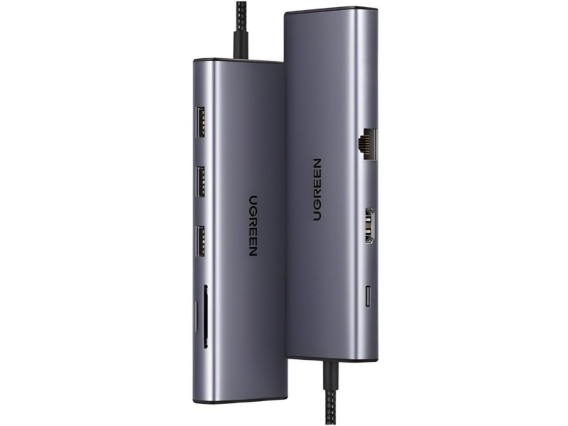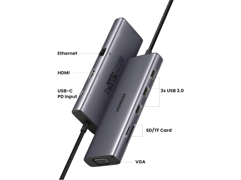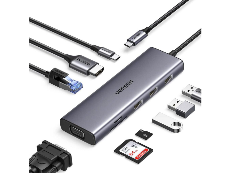 The UGREEN 9-in-1 Type-C Hub is a powerful and versatile expansion solution designed to enhance connectivity for laptops, tablets, and smartphones with Type-C ports. Featuring three USB 3.0 ports, 4K HDMI, VGA, RJ45 Gigabit Ethernet, SD and TF card slots, and a 100W Power Delivery (PD) charging port, this all-in-one hub provides fast data transfer, high-resolution display support, fast internet access, and efficient power management, all in a sleek, premium aluminium casing.